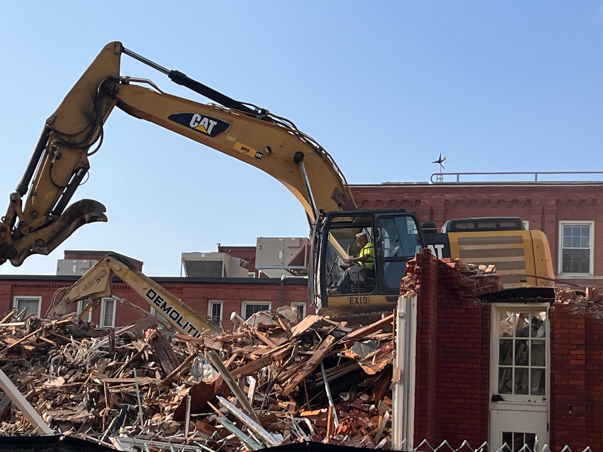 Well, yesterday from 5:30 to 7:30, I watched as the last fourth of Edwards (nearest the traffic light) was torn down. At times, I saw what was left of the whole edifice shake. And it was something to see the round window on the third floor busting out as a big, expertly maneuvered excavator gently peeled away a pillar of bricks.